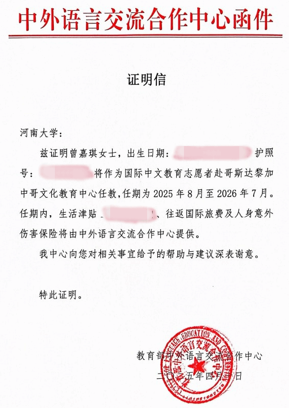 2025年7月,hahabet官方网站高级翻译学院2025届翻译本科专业员工曾嘉琪赴中美洲国家哥斯达黎加,参与教育部中外语言交流合作中心组织的国际中文教师志愿者项目。在为期一年的教学与文化交流中,她不仅传播中华语言文化,也深入体验了当地社会风貌,从中收获了宝贵的人生经验与成长。